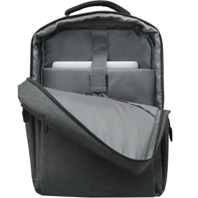 En el interior un compartimento Porta notebook, dos bolsillos organizadores y dos porta boligrafos. En el exterior un bolsillo frontal con cierre y otro de costado también con cierre. Correas regulables y acojinadas. Los cierres cuentan con tirantes engomados.