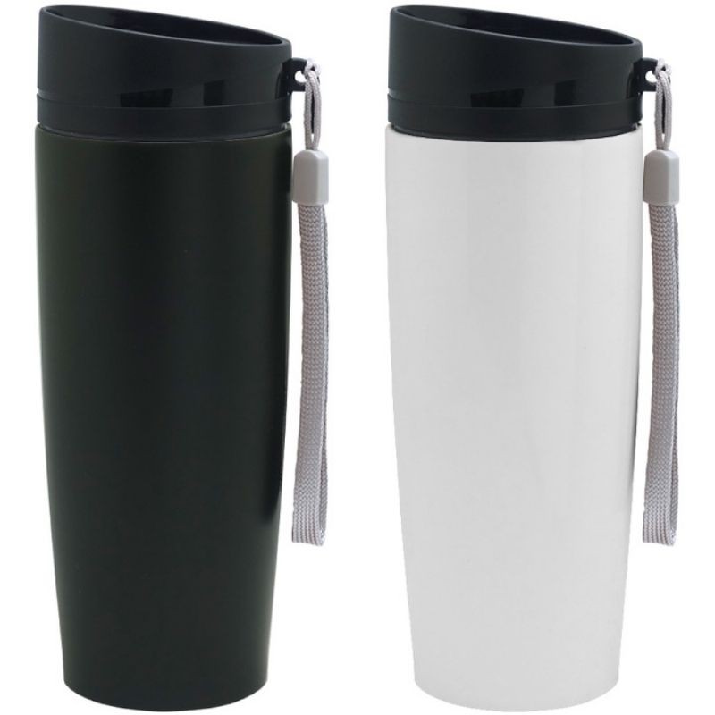 Acero inoxidable tipo 201 exterior y 304 interior. Doble pared. Tapa a rosca, botón para abrir y cerrar. Lazo para sujetar en la muñeca. Base antideslizante.