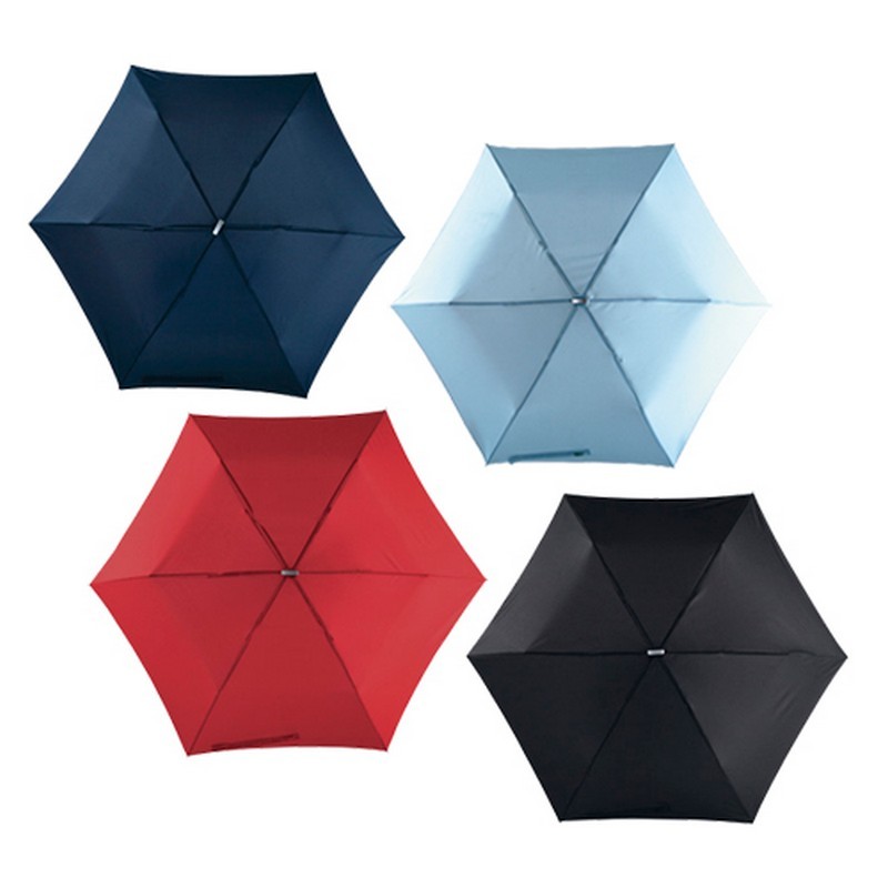 Mini Paraguas de 6 gajos con vara de aluminio. Varillas de aluminio / fibra. Mango plástico con espacio para imprimir.