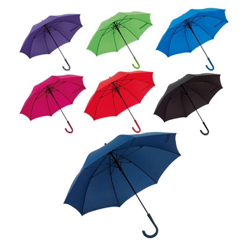 Paraguas con bastón metálico, varillas en fibra de vidrio, puntas metálicas y mango curvo de plástico.