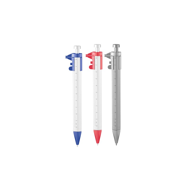 Pluma plástica con regla y mecanismo pulsador.