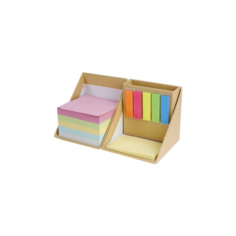 Incluye porta plumas y diferentes notas adheribles: 500 de diferente color, 25 amarillas y banderas de colores.