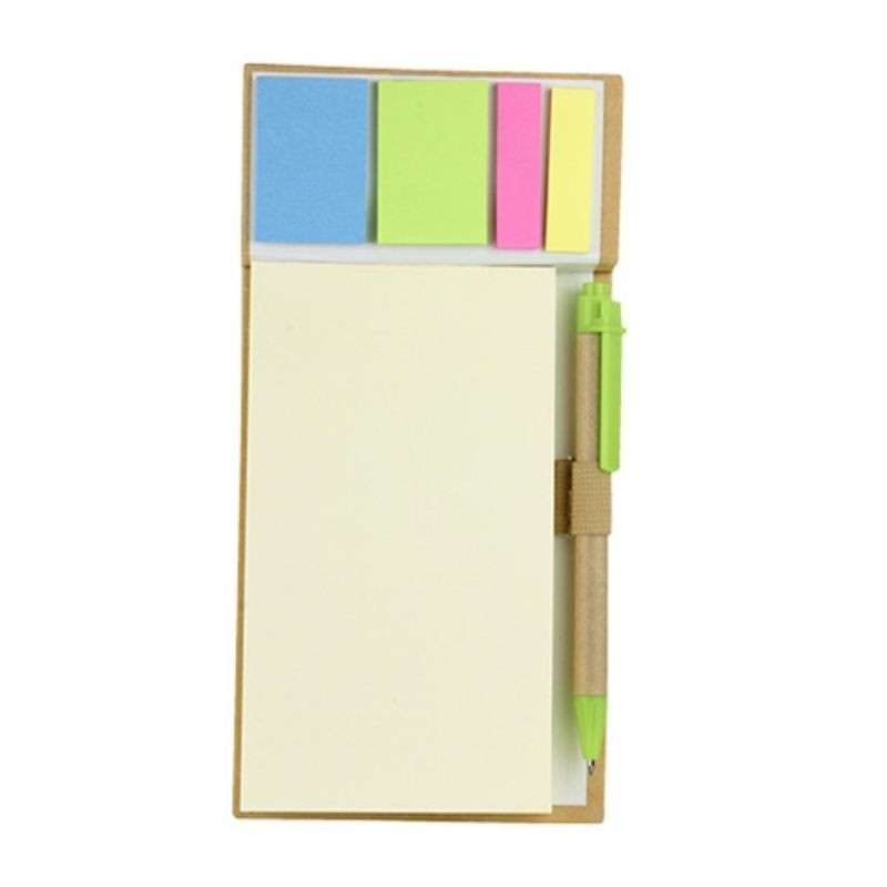 Incluye bolígrafo ecológico y notas adheribles: 100 en color beige y bandera de colores.