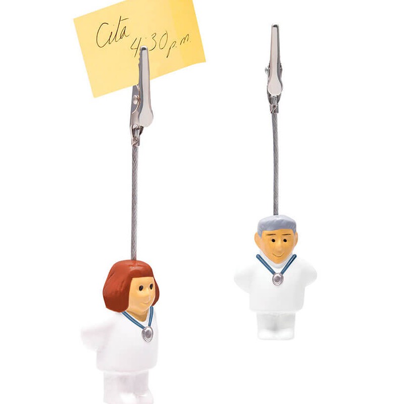 Porta tarjetas de escritorio elaborada de resina con clip metálico. Forma de Doctor y Doctora.