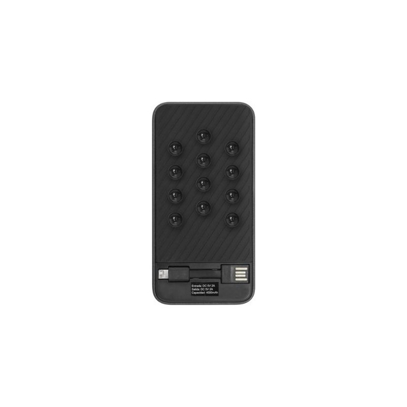 En la parte de atrás engomada con ventosas que permite la adhesión en el dispositivo que se está cargando. Cuenta con espacio para guardar el cable USB. Dos entradas: una mini USB que permite cargar Iphone y Android y una entrada USB. Botón de encendido y luces indicadoras de carga en el lateral inferior. La parte de adelante lisa con amplio espacio para personalizar. Capacidad 4000 MAH.