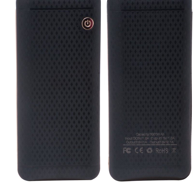 Power bank premium 8,000 mah. Incluye cable v8 con 3 puertos usb, boton de encendido y apagado e indicador de pila, disponible en dos colores