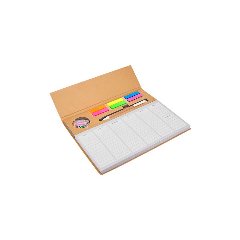 Descripción: PROGRAMADOR PRISTINA (Programador semanal con 100 hojas. Incluye bolígrafo ecológico, clips y banderillas adheribles de 6 colores.)