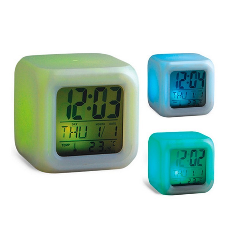 Alarma, calendario, termómetro, luz al presionar y 7 colores destellantes.