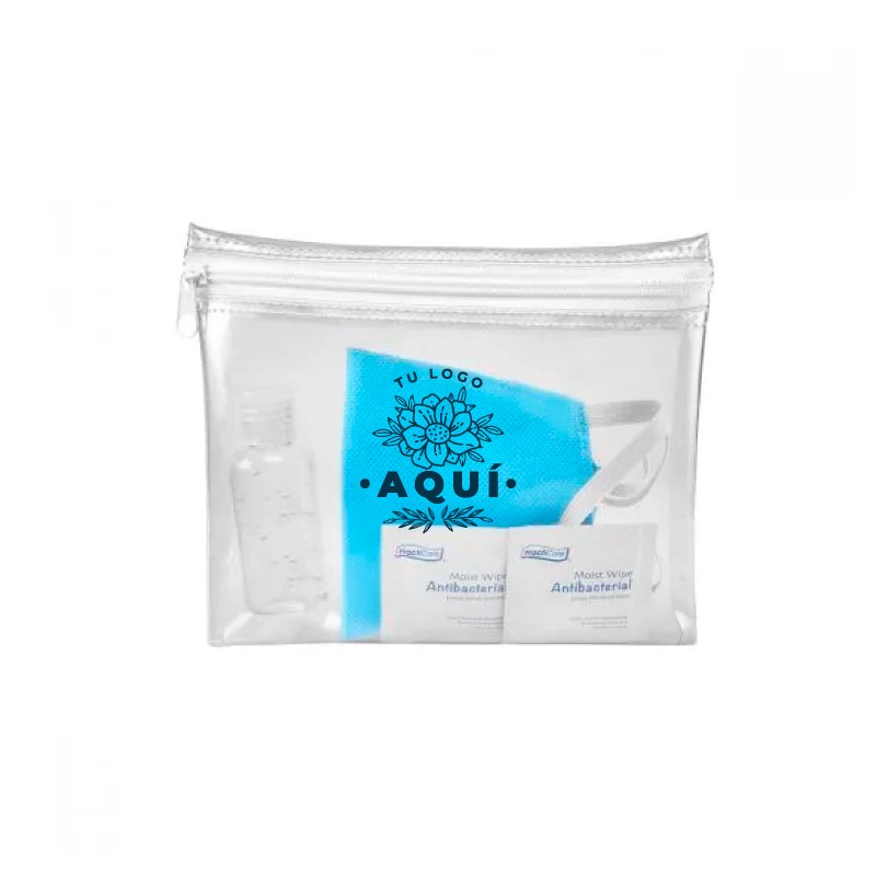 Contiene 1 gel antibacterial de 40 ml, 2 toallitas desinfectantes y un cubrebocas de doble capa, material Non-woven, lavable y puede utilizarse un aproximado de 5 veces.