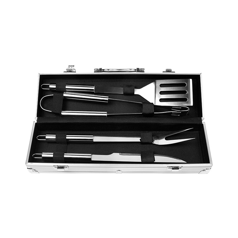 Set bbq de 4 piezas en acero inoxidable. incluye estuche de aluminio.