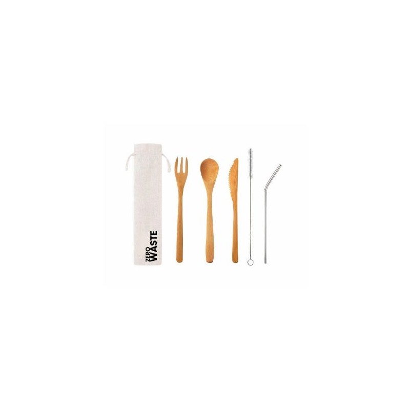 Set de Cubierto de bambú, popote de acero inox. con cepillo limpiador en bolsa de lino de 26 cm x 6.35 cm con jareta.