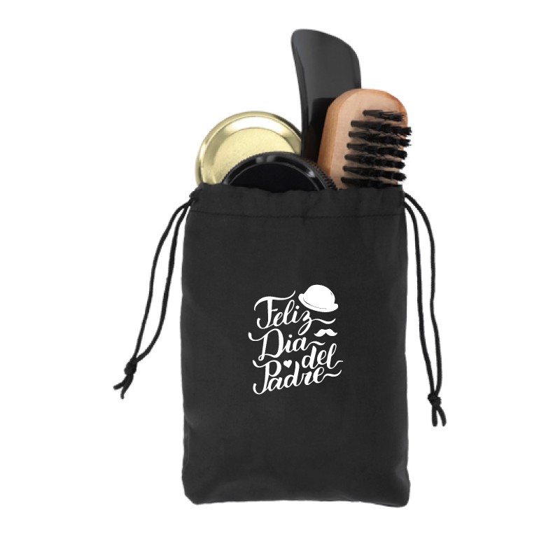 Set de boleado para calzado con estuche de poliéster y correa ajustable que incluye: calzador, cepillo de madera, paño, lustrador con esponja y grasa en crema color negro.