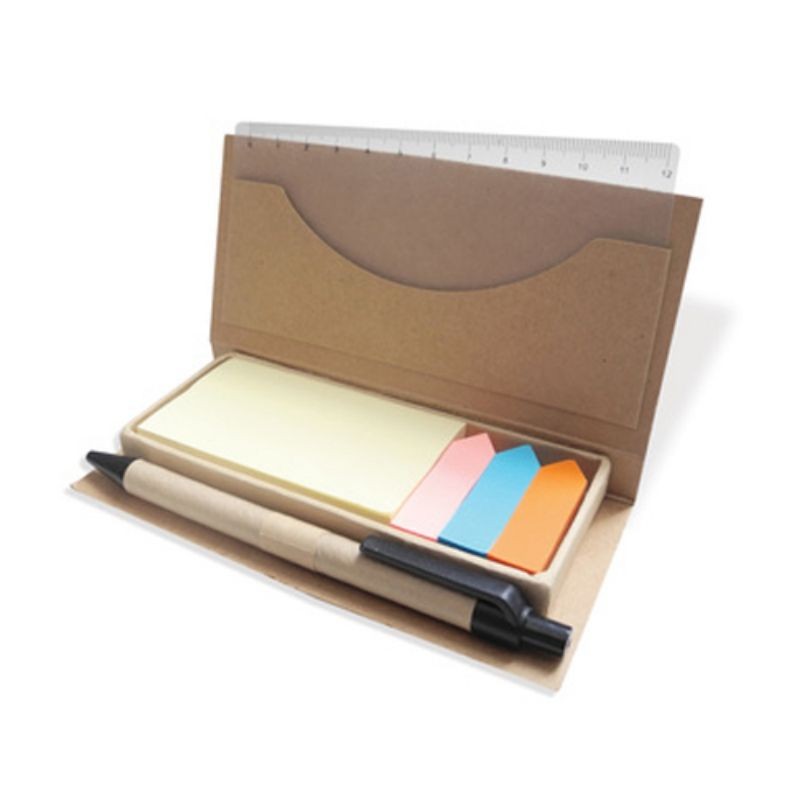 Set de regla, 1 block adhesivo cuadrado de color y 3 en forma de flecha, 1 bolígrafo.