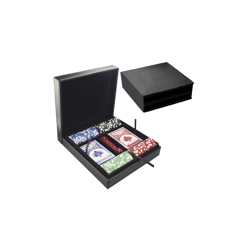 En estuche de Curpiel. Incluye cartas profesionales, dados y fichas.