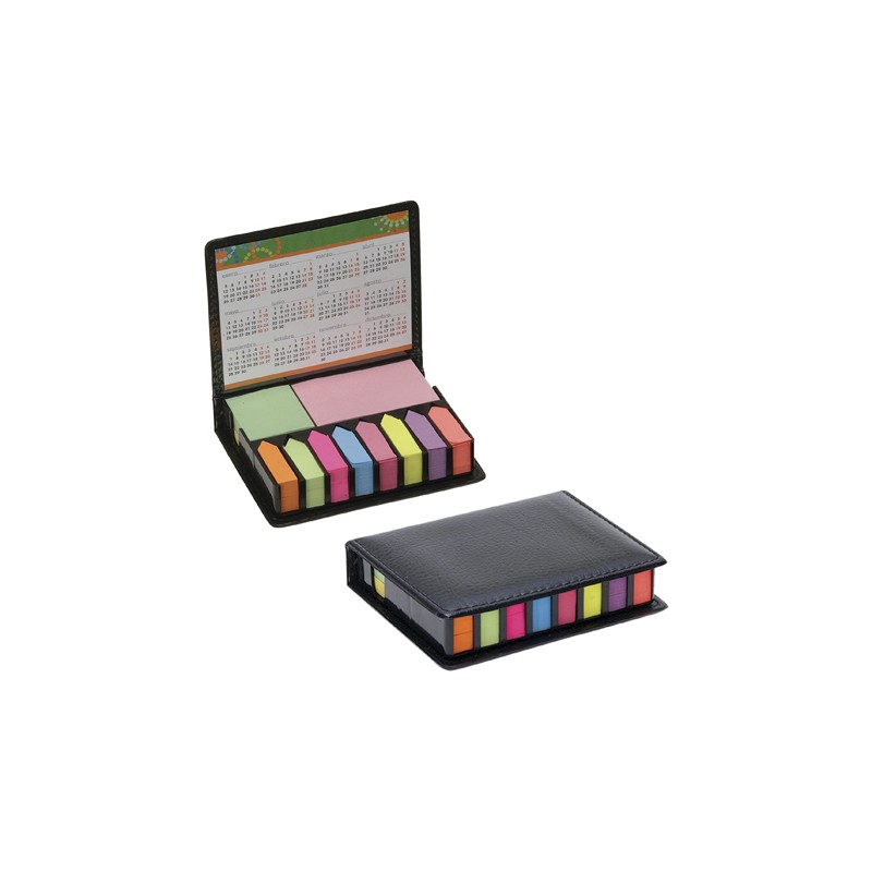 Set de notas adhesivas de diferentes colores contenidas en estuche de curpiel color negro, contiene calendario de 2 años.