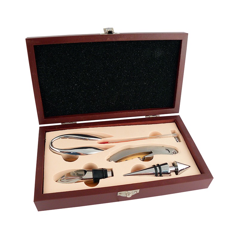 Set para vino en caja de madera rectangular, con 5 piezas; saca corchos (con navaja y destapador), vertedor de vino, tapón corta gota, corta cápsula de vino y termómetro.Medidas: 13x23 cm.