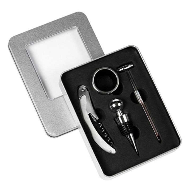 Set para vino en caja metálica con ventana, 4 piezas; saca corchos (con navaja y destapador), termómetro, tapón corta gota y aro antigoteo.