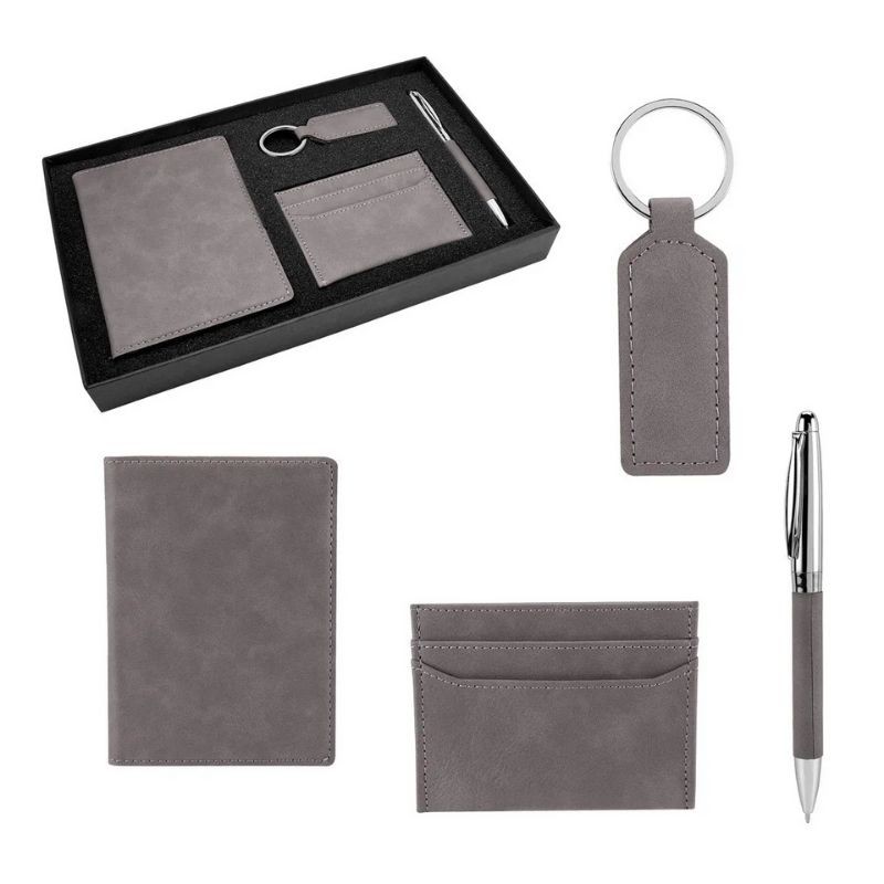 Incluye llavero, porta pasaporte, tarjetero, bolígrafo y caja de regalo.