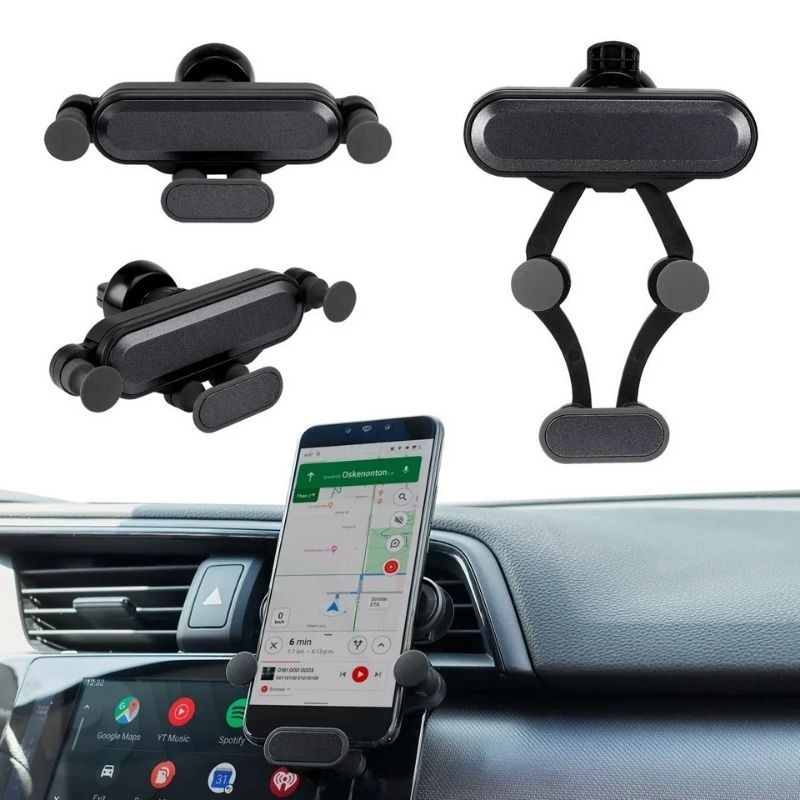 Soporte con mecanismo ajustable para smartphones. Ángulo de rotación de 360°. Se monta en las ventilas del aire acondicionado.