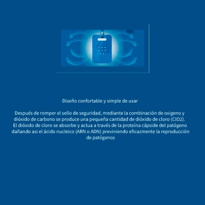 Úselo alrededor del cuello para bloquear virus y bacterias. Elimina los virus y las bacterias que flotan a tu alrededor con la función del dióxido de cloro. Protéjase de los virus y las bacterias con la baja concentración de dióxido de cloro que crea un escudo protector de hasta 1 metro, úselo en lugares abarrotados como transporte publico, metro, oficinas, escuelas, hospitales, etc etc.