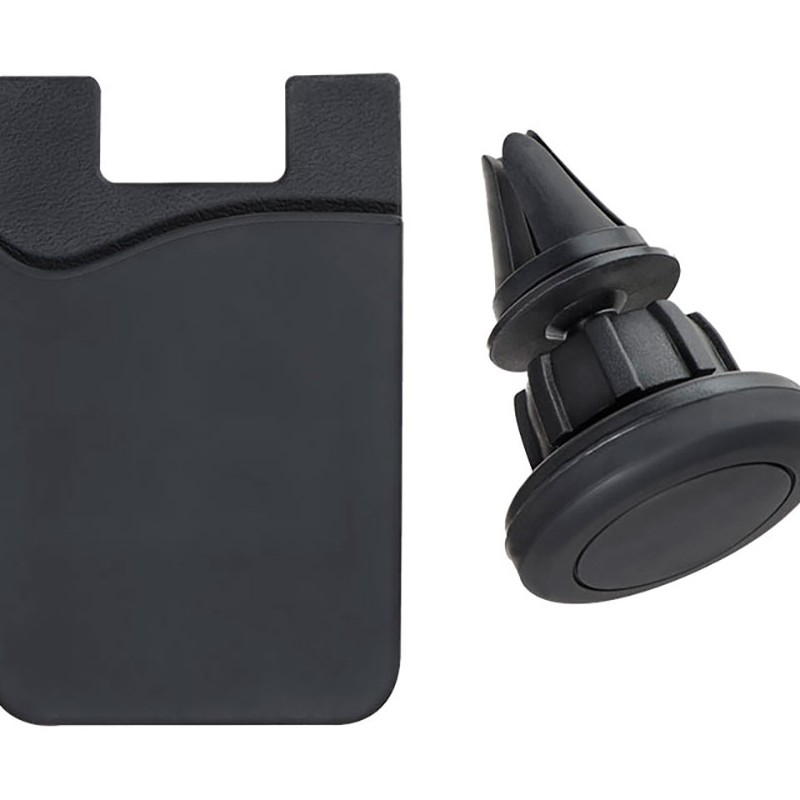 Tarjetero para celulares de silicón con placa de metal que se fija a un soporte magnético que se coloca en la ventilación del automóvil.