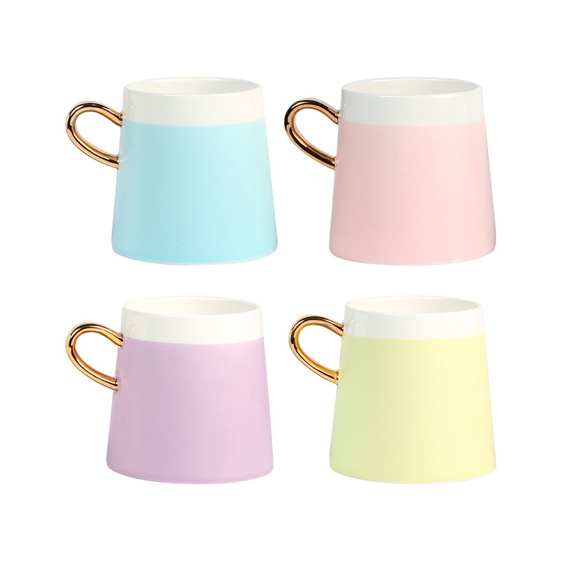 Taza fabricada en cerámica con asa en terminado dorado, capacidad 12 onzas (360 ml).