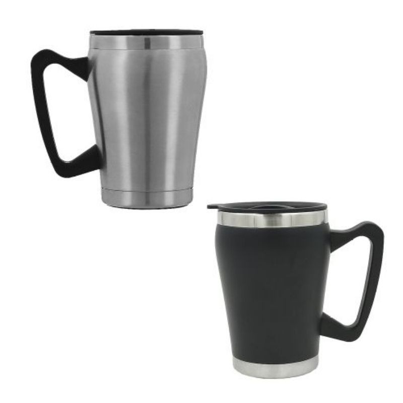 Taza térmica con doble pared de acero inoxidable y asa de plástico.