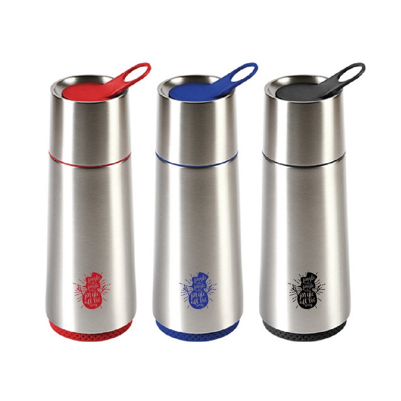 Termo de acero Inoxidable con arnés y compartimento pastillero. 370 ml.