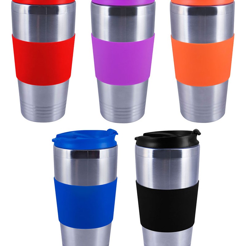 Termo con doble pared de acero inoxidable y grip de silicón con capacidad de 450 ml. Tapa de rosca.