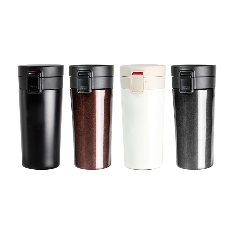 Termo de doble pared fabricado en acero inoxidable con tapa de seguridad y sistema automático de apertura, capacidad de 350 ml.