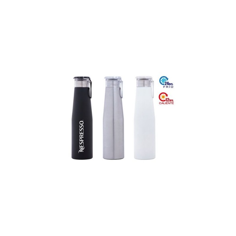 Termo de acero inoxidable con doble pared, insulado al alto vacío. Cuenta con sellado hermético y asa para transportar. Cap. 700 ml.