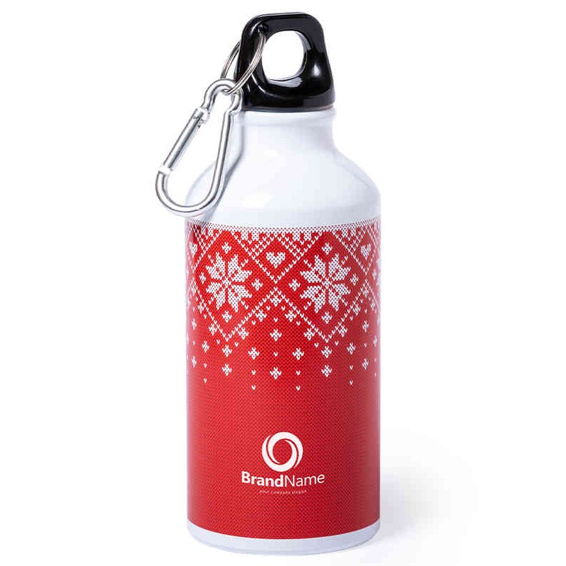 Bidón de 400ml de capacidad con cuerpo de acabado aluminio, en diseño bicolor de navidad. Con tapón de seguridad a rosca y mosquetón metálico de transporte. Presentado en atractiva caja de diseño.
