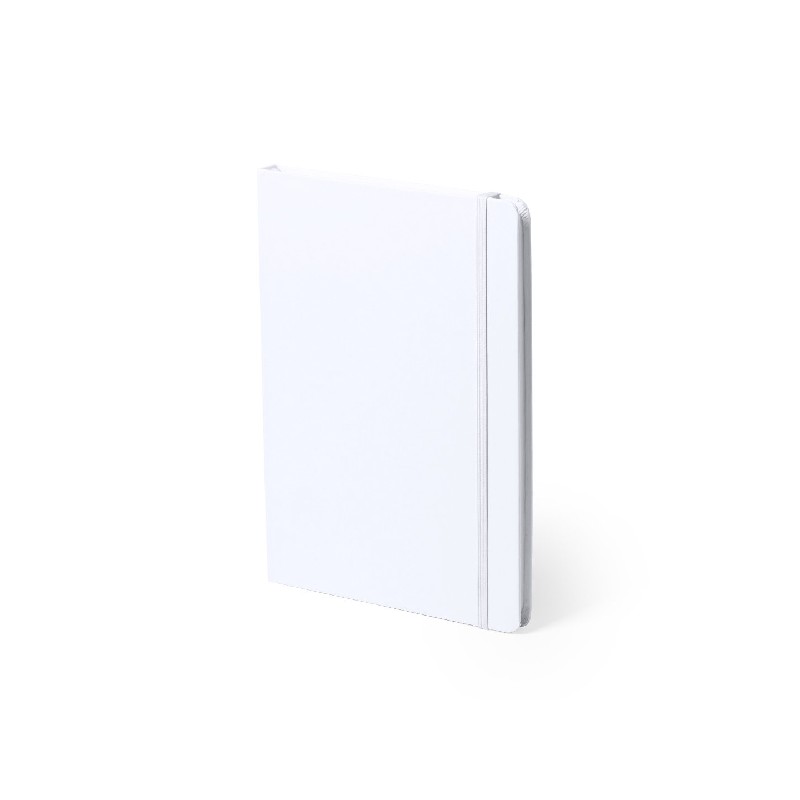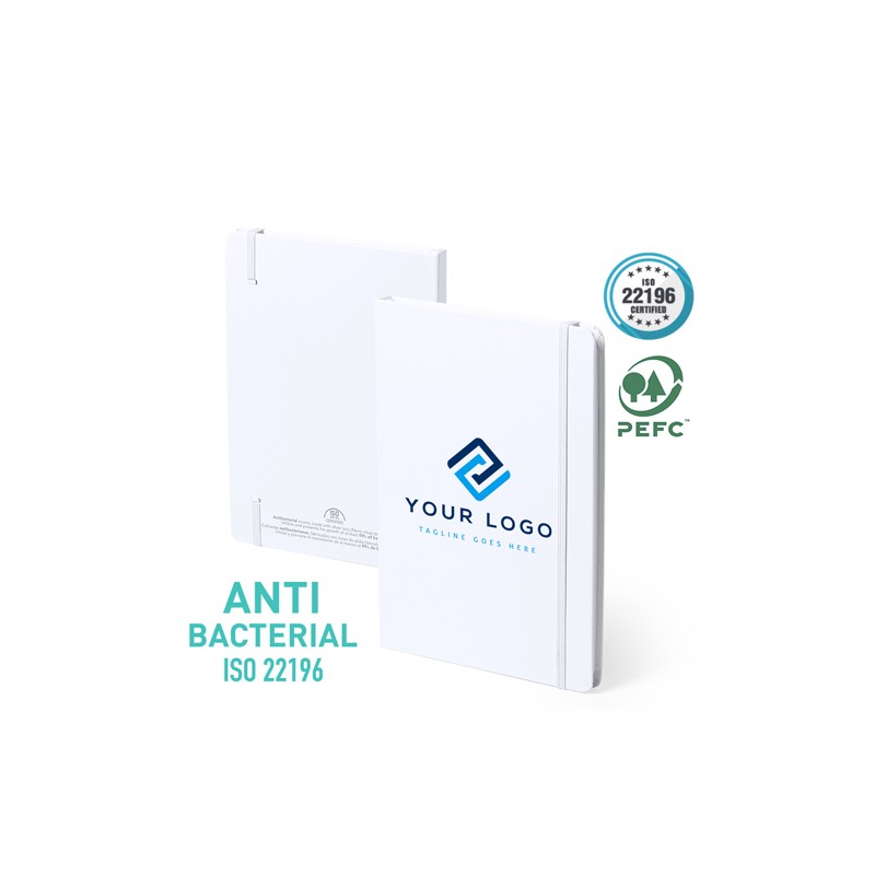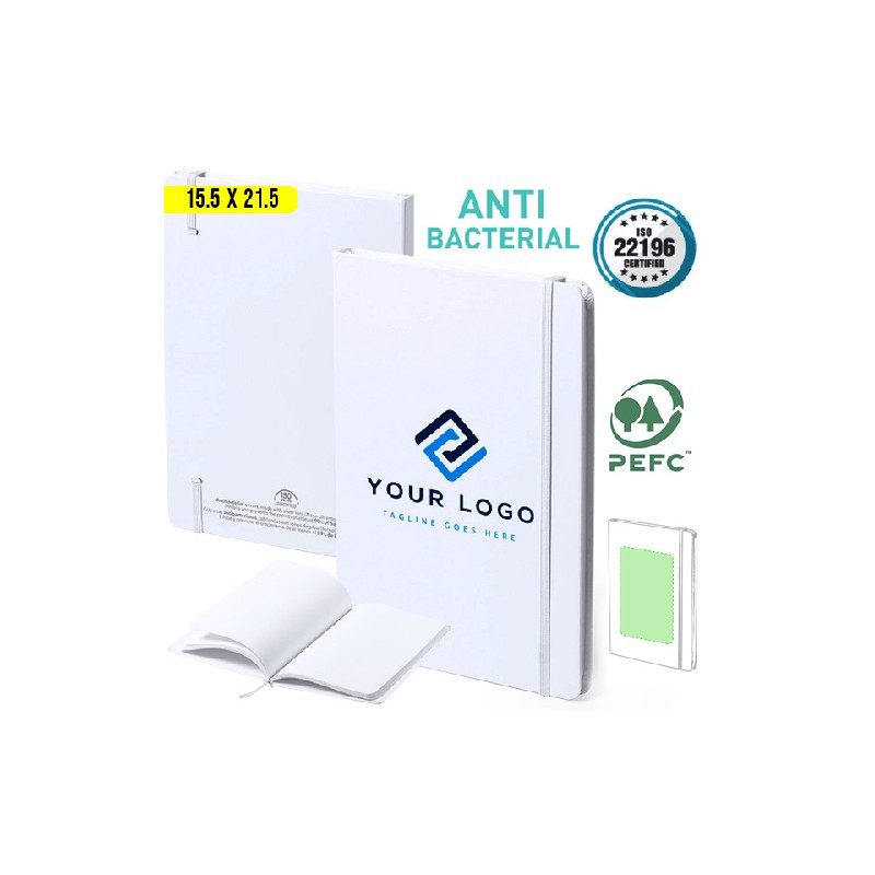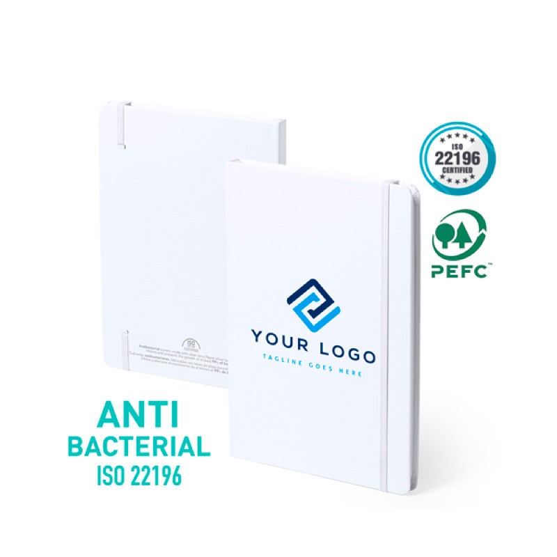 Bloc de notas tamaño A5 con tapas antibacterianas rígidas de cartón laminado. En elegante acabado blanco mate y encuadernación cosida.